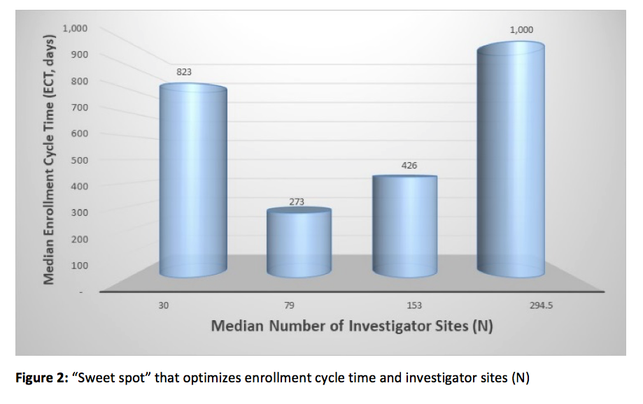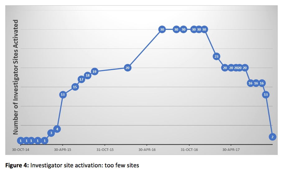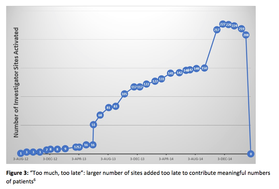 The disparity between actual and recommended SEI illustrates one of the perils of activating too many investigator sites: activating a large number of sites takes time, especially in the early stages of a trial. In the trial described above, the team was forced to push too many sites forward with limited resources, and a large percentage of sites were activated near the end of the ECT, when the team was spread too thin by focusing on too many nonproductive tasks, and was unable to focus on maximizing returns from the most productive sites. In short, there is such a thing as “too big to succeed.”