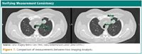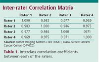 The IAs, blinded to clinical assessments, independently selected and measured the longest diameter of 186 lesions from 20 CT scans (see Figure 1). The CT scans included a variety of diseases, including gastrointestinal stromal tumor, gynecological, breast, and lung malignancies.