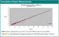 Figure 2 shows the correlation of measurements between rater 1 and 4. Furthermore, only 5.4% of the measurements needed to be revised following radiologist review, reducing radiologist assessment time by greater than 40%.