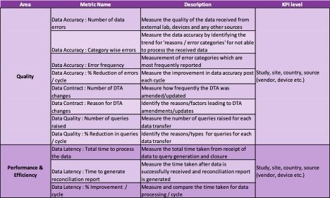 Each study and data type has varied demands. Hence, the success of standard data transfer ecosystem depends upon an effective monitoring of quality, compliance, and efficiencies through metrics. Metrics also contribute to driving delivery governance and enables effective activity management. Periodic analysis of metrics not only reflects partnership maturity but also provides a “true picture of delivery” by representing gaps and quality of deliverables for all processes under purview. Key metrics suggested including: