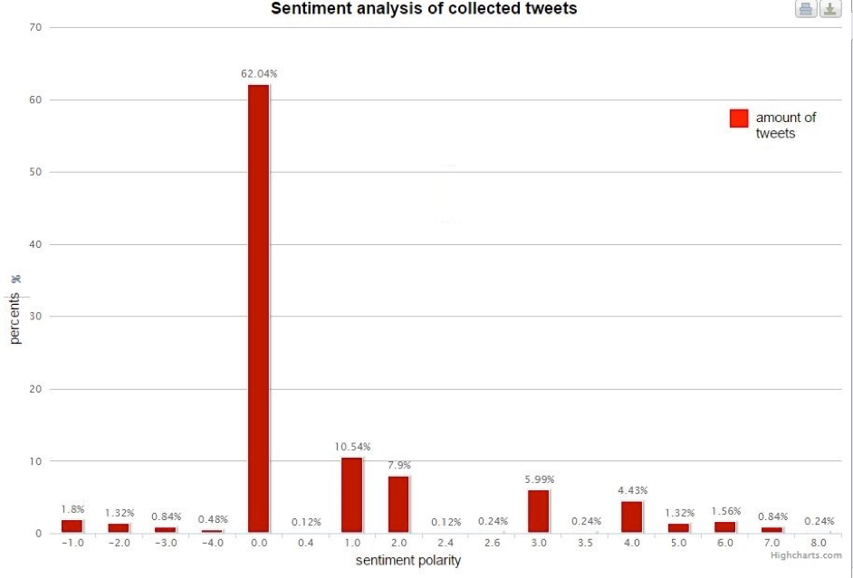 We then created a bar chart showing general sentiment polarity percentages of the tweets (Figure 1). The numbers on the horizontal axis represent the sentiment polarities assigned to the tweets by the sentiment classification algorithm; in particular, a positive number indicates a positive sentiment, a negative number indicates a negative sentiment while 0.0 indicates a neutral sentiment. The higher a positive number is the better the opinion, while the higher a negative number is the worse the opinion. Percentages on the bars indicate respectively the number of tweets classified with the corresponding polarity compared to the total of the tweets. We summed the percentages corresponding to positive numbers to get the total of positive results and then we did the same for negative cases.
