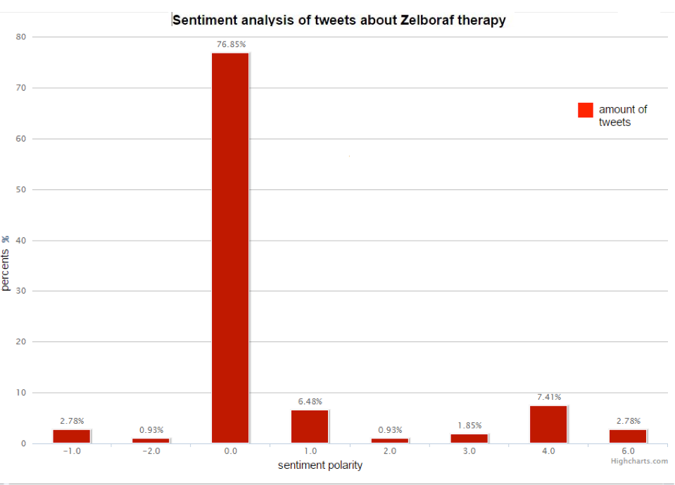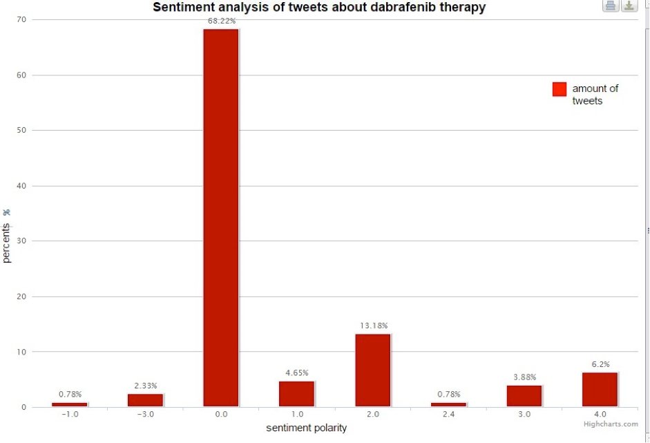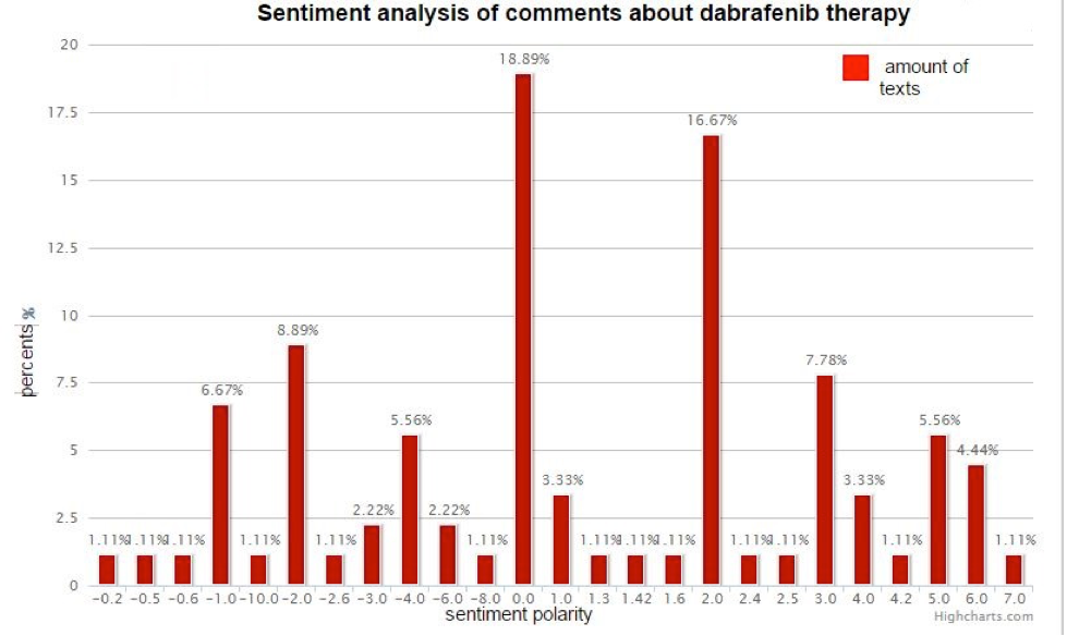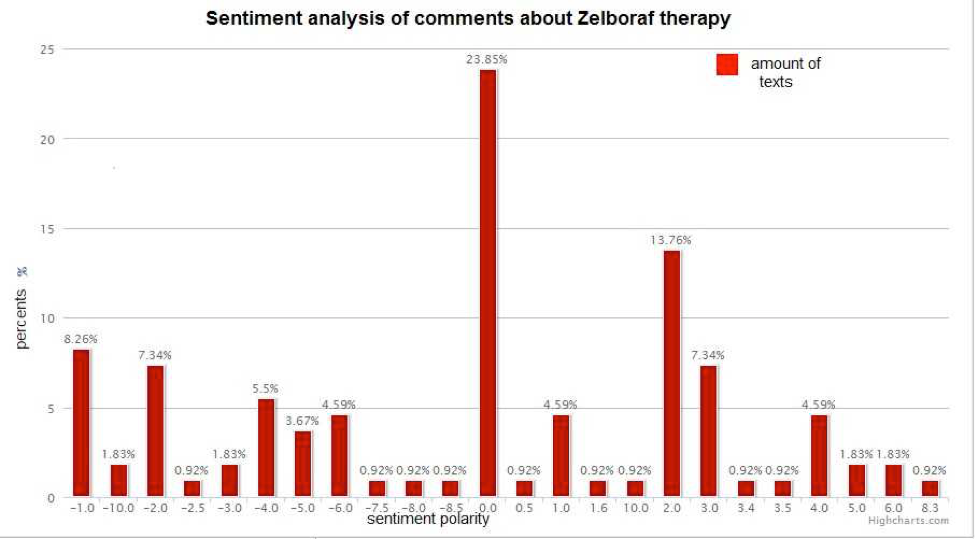 Using sentiment analysis on comment texts about Zelboraf treatment it resulted that the overall tone was positive (40%) even if there was also a small number of high negative cases (-10, -8.5), while the neutral cases corresponded to the 23.85% (Figure 5)