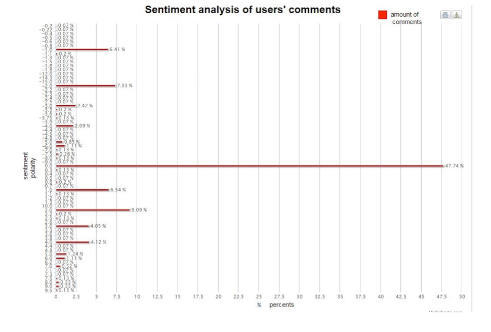 We used sentiment analysis on the comment texts and then we showed the results using a bar chart (Figure 7). The numbers on the vertical axis represent the sentiment polarities assigned to the texts by the sentiment classification algorithm; in particular, a positive number indicates a positive sentiment, a negative number indicates a negative sentiment while 0.0 indicates a neutral sentiment. Percentages on the bars indicate respectively the number of texts classified with the corresponding polarity compared to the total of the texts. We summed the percentages corresponding to positive numbers to get the total of positive results and then we did the same for negative cases. As we can see from the bar chart in Figure 7, the overall tone associated to comments is neutral, as shown by the 47.74% peak at 0.0. Differently to the previous examples, in this case the range of the sentiment polarities is more scattered with more fluctuation of high positive and high negative sentiment scores (9.5, 10, -12, -15, -14).