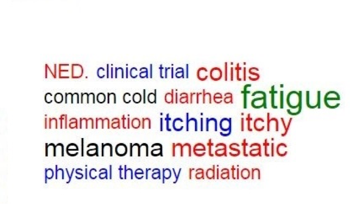 The review of the comments in the social media postings enabled us to retrieve several references to side effects such as “diarrhea”, “fever”, “fatigue”, “colitis”, “itching”, “weight loss” and treatments associated to them (Dabrafenib, Yervoy, Interferon). In some cases, different expressions are retrieved referring to the same adverse event, such as “tiredness”, “feel fatigued” to mean “fatigue”. Some of the side effects mentions are shown with other entities in the tag-cloud in Figure 9.