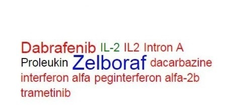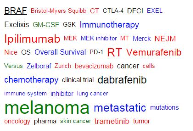 Entity extraction enabled us to retrieve references of GSK and Roche treatment (“Vemurafenib”, “Dabrafenib”, “Trametinib”,“combo”) as well as other melanoma treatments references, such as Yervoy (Ipilimumab), Dacarbazine, IL-2, Interferon Alfa, and we could also use sentiment classification on these entities in order to understand users opinions about them. In Figure 8 we showed some treatment entities using a tag-cloud.