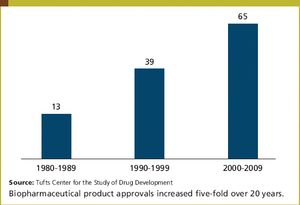 Biotechnology is delivering substantially higher numbers of new product approvals. During the period 2000 to 2009, 65 biopharmaceutical products received US marketing approval, nearly double the number of products approved during the 1990 to 1999 period and five times the 1980 to 1989 level.