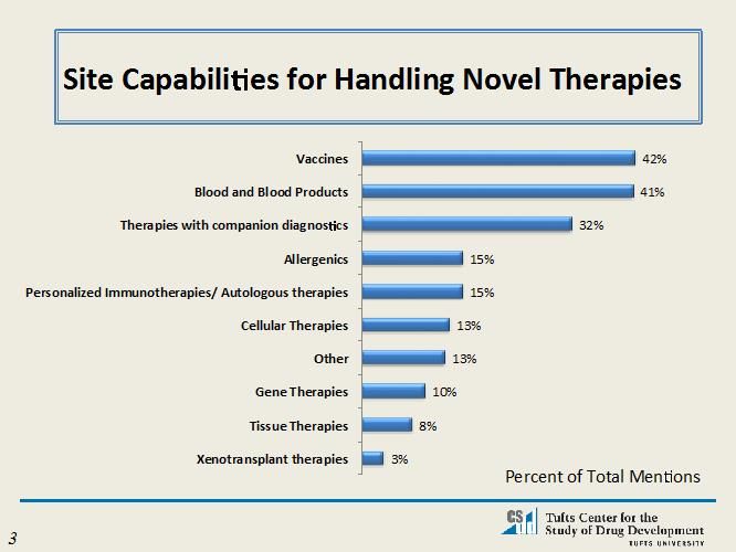 Sites also indicate that they have limited abilities to handle novel therapies such as gene therapies or personalized immunotherapies. The highest proportion of sites indicate that they are able to handle vaccines (42%), blood and blood products (41%), and therapies with companion diagnostics (32%) (see Chart 1.)