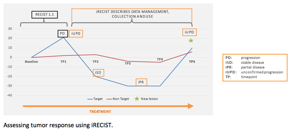 iRECIST calls for the use of modified RECIST in cancer immunotherapy trials and describes a standardized approach to measuring solid tumors and defining objective change in tumor size for clinical trials.4 iRECIST also introduces a new response criterion known as immune unconfirmed progression of disease (iUPD), which describes new overall response.