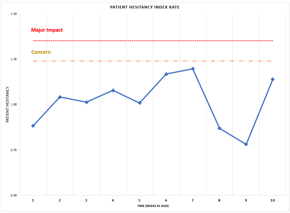 Results and outlook: In the early weeks of the outbreak, patient hesitancy decreased. We believe this is potentially a result of an increase in health information-seeking behaviors as pandemic information became more prevalent. Last week, however, reversed that trend, and we noted a significant increase in patient hesitancy. We believe patient sentiment may be a significant driver of enrollment rate changes and we continue to monitor this data closely.