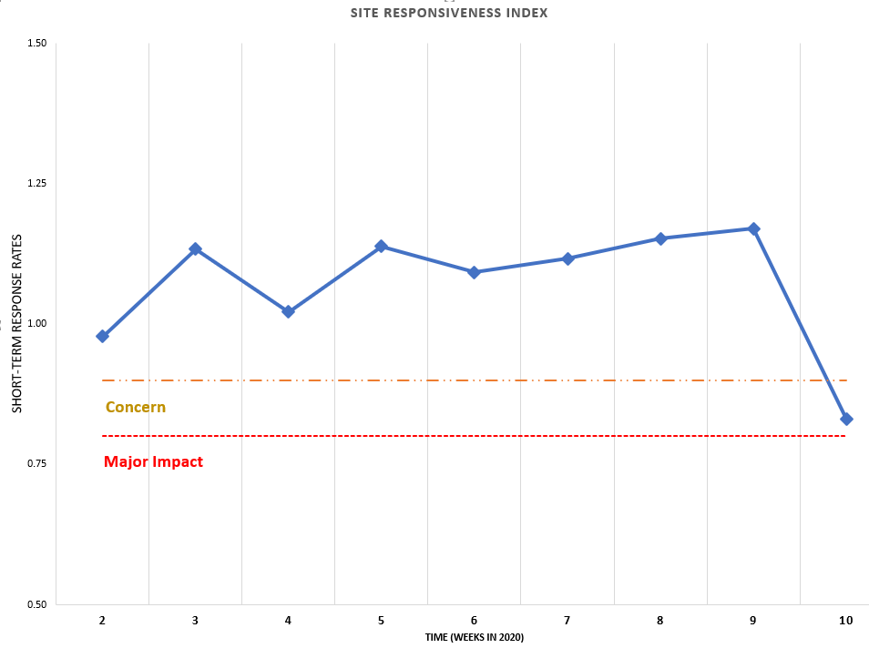 Results and outlook: In the first two months of 2020, sites exhibited extremely consistent performance in reaching out to potential trial participants. However, the week of March 9 saw a major drop in responsiveness-well below levels of any time this year. While a single week cannot definitively indicate a trend, we believe site responsiveness to potentially be the single largest driver of short-term impact on enrollment performance.