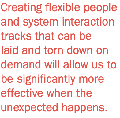 As an industry, we must think of ways in which collaborations can be codified to ensure that the data from all the various capture systems is made available at the proper time to the right individuals and in the appropriate context. Creating flexible people and system interaction tracks that can be laid and torn down on demand will allow us to be significantly more effective when the unexpected happens, while giving us both a roadmap and a history of our decision-making processes.